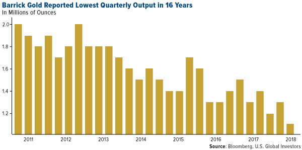 Take a look at the declining quarterly output of Barrick Gold, the world’s largest gold miner. According to its preliminary results for the first quarter, Barrick produced a total of 1.05 million ounces from its 10 projects. That’s only a 2 percent decrease from the same quarter last year, but a far cry from where it was seven years ago.