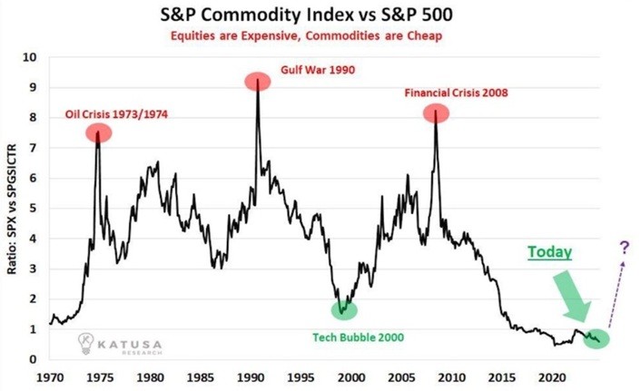 Kitco News ran a chart in 2024 showing that equities are expensive and commodities are cheap.