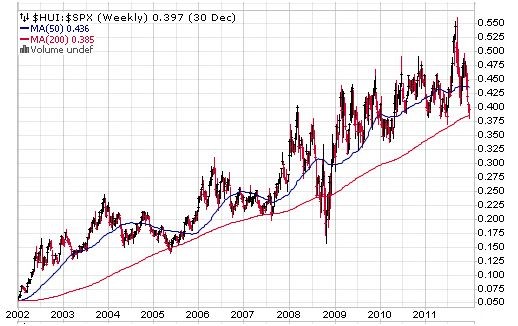 Long-term trends take a long time to reverse. One such trend compares gold mining stocks to the S&P500 stocks. From 2002 until 2011 gold mining stocks outperformed generic stocks, as can be seen in the following chart. (Charts courtesy Stockcharts.com).