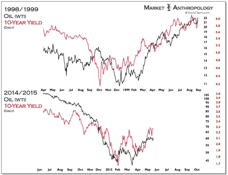 We continue to closely follow the SPX:Oil ratio through a comparative prism of the two major exhaustion pivots (1986 & 1999) that make up the asymmetrical disinflationary/reflationary construct that the ratio represents. Although both timeframes depict market environments that saw oil outperform equities over the subsequent year, there were notable differences in the magnitude of the moves relating to various intermarket relationships - namely, inflation and policy expectations which greatly determined the direction of yields for the year.