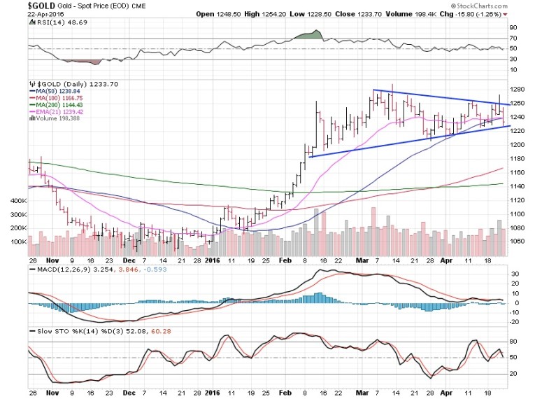 Gold closed the week out losing just 0.17% -- and is still holding in the triangle pattern. I don’t like the fact that gold closed the week below the 21 and 50-day moving averages. However, it’s still holding above the $1,225 lower support level of the triangle.