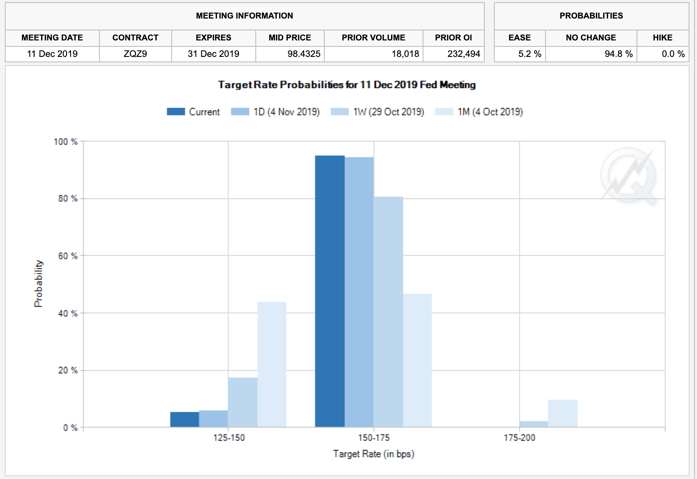 Since the most recent rate cut, we have seen the probability of further interest rates cuts by the US Federal Reserve swing from almost a 50% chance of further rate cuts in December, now to a 5.2% chance of further rate cuts from the Fed. Essentially the market is pricing in no further rate cuts. What does it mean for the yield curve? What does it mean for gold, gold stocks, and the S&P 500?