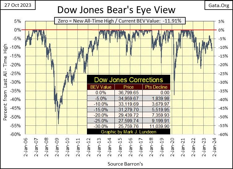 I suspect a major difficulty for the COMEX goons’ effort to keep the price of gold down, is from the bond market, which has been in a massive bear market for years. This bear market in bonds is sending flight capital into gold and silver, feeding the current bull market in gold. In BEV terms, how much further must the Dow Jones deflate before the investing public becomes aware of the bull market in gold? A BEV of below -15%, maybe -20%?