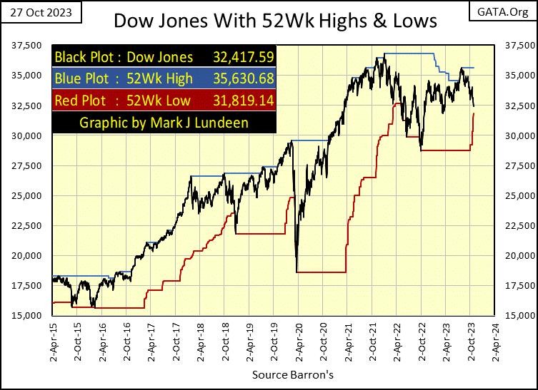 In this week’s performance tables above, gold (#1) was the only item that saw actual gains for the week. Silver was down, but kept its #3 position in the table. The XAU advanced from #13 last week, to #10 at this week’s close, not by going up, but by going down. The XAU’s secret to its success was to have some of the indexes above it last week, go down even more than it did this week.