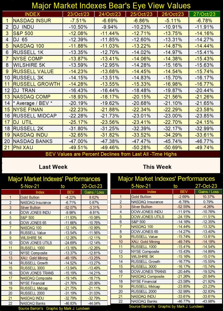 Speaking of Mr Bear clawing back market valuation, what did the NASDAQ Banking index (#20) close the week at? A claw-back of -46.77%, and that is not good! Should bond yields continue climbing as they have all year, we can count on these banks’ BEV values breaking far below -50%, and seeing the idiots at the FOMC intervening to “stabilize the market” once again.