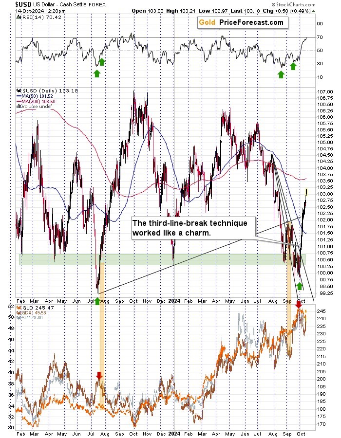 The USD Index soared from below 100 and it continues to soar even today. As the RSI moved over 70, we might see a correction here, but it’s unlikely to be something write home about – back in 2023 we saw only brief corrections that were then quickly followed by new highs.