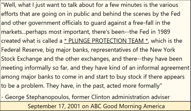 But that isn’t the way I see it. Nope, I’m with George Stephanopoulos of ABC News below, where on his show; Good Morning America’s program of 17 September 2001, George talked about the Plunge Protection Team, and what the PPT does when markets begin free falling.