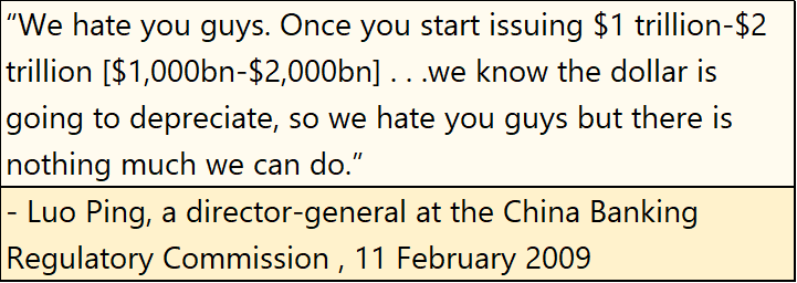 Luo Ping, director general of the China Banking Regulatory Commission, way back in February 2009, during Dr. Bernanke’s first quantitative easing clearly defined the dollar’s problem in the quote below.