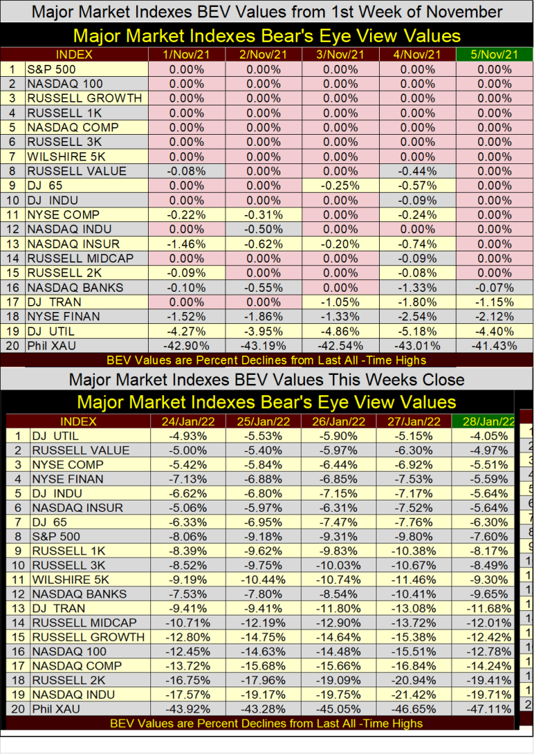 Below I have two tables for my Major Market Indexes BEV Values. The upper table was from the first week of last November. The lower table for the close of this week. In the first week of early November, these indexes made sixty-two new all-time highs (Pink BEV 0.00%) in the table above.