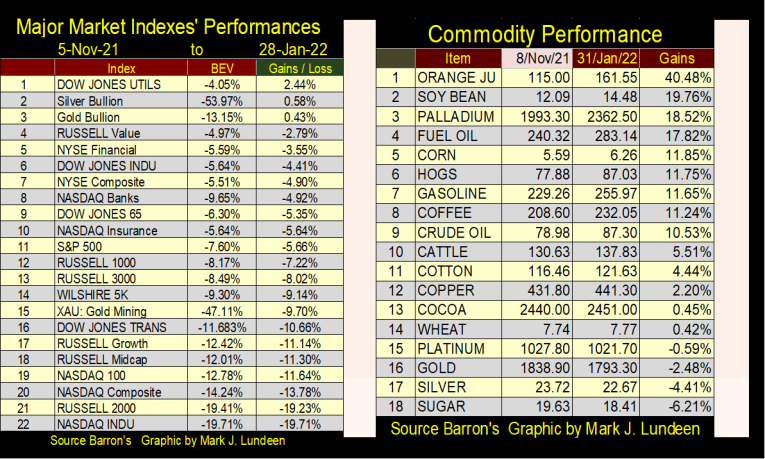 I believe the problem with the stock market can be seen below, comparing the performance of the major market indexes to commodity prices since the first week of last November, twelve weeks ago. The major market indexes (Left Table) have only one index with positive gains; the Dow Jones Utility Average. All other major market indexes are down from where they were last November.