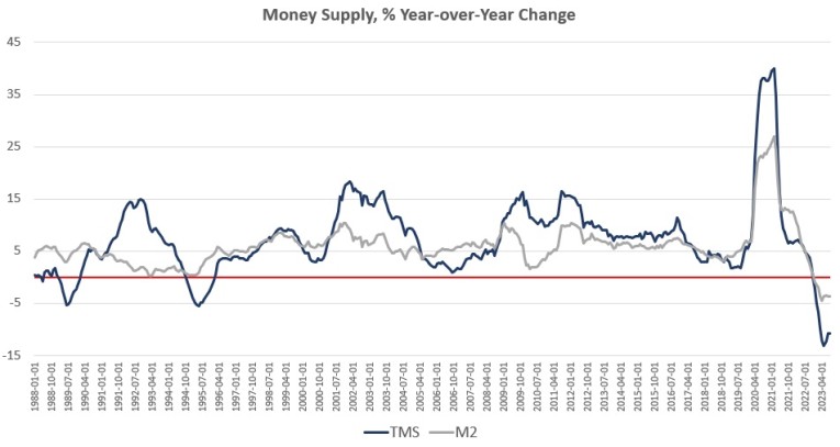 In recent months, M2 growth rates have followed a similar course to TMS growth rates, although TMS has fallen faster than M2. In August 2023, the M2 growth rate was –3.7 percent. That's unchanged from July's growth rate of –3.7 percent. August 2023's growth rate was also well down from August 2022's rate of 3.8 percent.