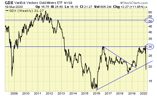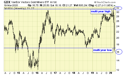 GDX reached a multi-year high of $32 in Feb, in a false breakout (hindsight), and then within three weeks, broke down to a multi-year low at $16.