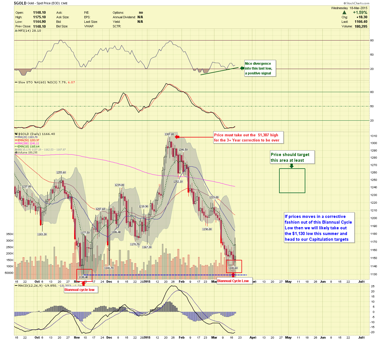 Where does that leave us on a larger scale? As long as the price holds above the $1,130 low made in November of 2014 there is a chance the 3+ Year correction is over. If price falls below that low, then the capitulation versions (part 1 of this three-part editorial) will be in play. Gold prices were dangerously close to the $1,130 level and for that reason this week was critical for the Metals prices.
