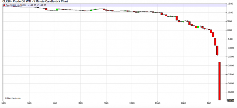 Without any parties looking to buy creating an actual bid-ask spread, the bidless market is an environment where only sellers exist on the offer. Price then resets lower and lower until buyers finally emerge. In NYMEX crude, that "price" was actually NEGATIVE. Amazing.