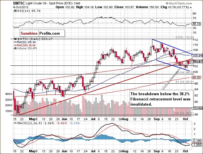 Taking the above into account, investors are probably wondering: what could happen if the recent positive divergences between both commodities remain in place? Can we find any guidance in the charts? Let‘s take a look at the charts below and try to find answer to this question. We’ll start with the daily chart of crude oil (charts courtesy by http://stockcharts.com).