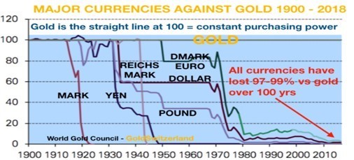 Even more importantly, neither journalists, nor investors understand that gold doesn’t go up at all. Since gold represents constant purchasing power, it is not gold that goes up but the value of paper money that goes down.