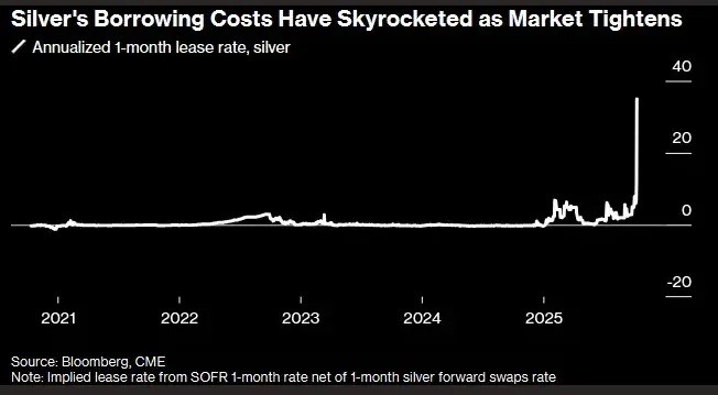 [Silver] Lease rates in London have exploded to 39%, a full-blown panic signal…. If banks can’t find the metal, they’ll be forced to buy back futures or deliver actual silver - both actions that could ignite a violent price surge.