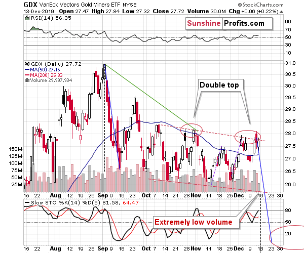 We haven’t seen volume this low in months. The last time when the GDX moved higher on a similarly low volume, was in late July. And what happened immediately thereafter? Miners plunged. Yes, they came back shortly thereafter, but the immediate reaction was very negative. This perfectly fits the implications of gold and silver charts.