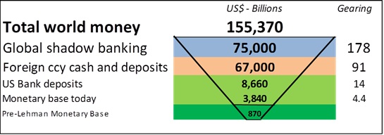 The gearing of total world money and credit on today's monetary base is forty times, but this is after a rapid expansion of the Fed's balance sheet in recent years. Compared with the Fed's monetary base before the Lehman crisis, world money is now nearly 180 times geared, which leaves very little room for continuing stability.