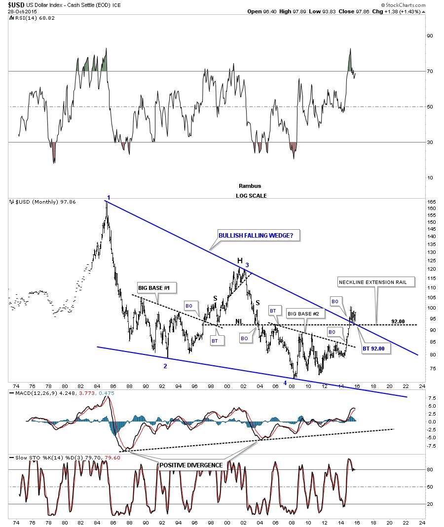 Below is the 40-year chart for the dollar which shows the massive bullish falling wedge which broke out eight months ago. The top rail has held support like a rock during the back-testing process. This is only speculation on my part right now but the price objective of a rising or falling wedge is usually the first reversal point within the wedge itself. Here you can see the first reversal point occurred back in 1985 around the 165 area. Only time will tell us what lies ahead for the US dollar.