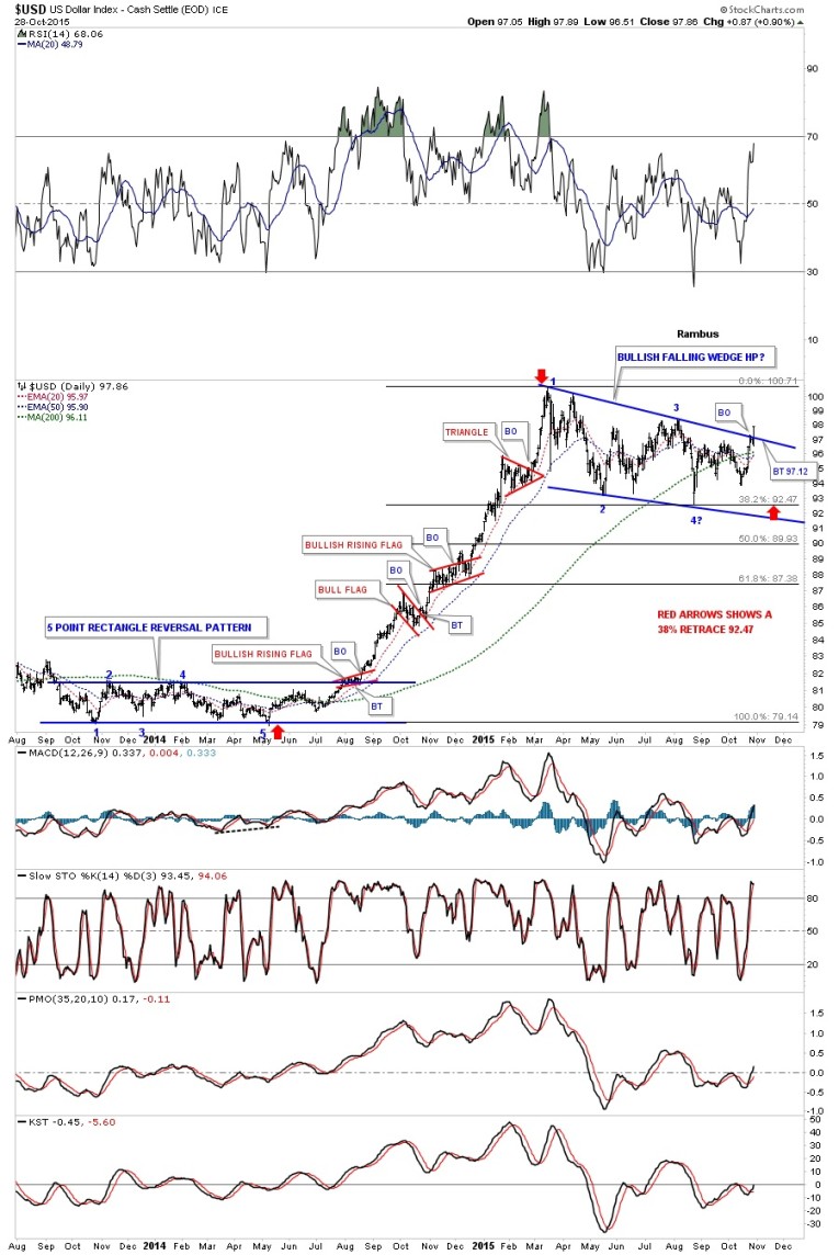 There are some positive developments in regards to the US dollar on the daily chart below. First there are four completed reversal points in the blue bullish falling wedge. This eight month consolidation pattern corrected 38% of the first big impulse leg up as shown by the red arrows. The 20-day ema has just recently crossed above the 50-day ema giving a buy signal. The US dollar is now trading well above its 200-dma which shows the long term nature of this bull market.