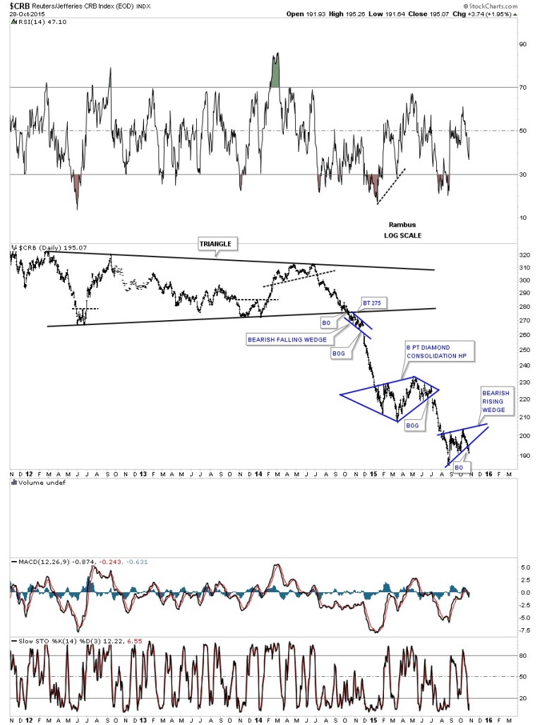 After breaking down from the black triangle reversal pattern the CRB index has been creating one consolidation pattern below the next. You can see how our current bearish rising wedge fits into the bigger picture. Once the back-testing process is finished I expect to see a similar move between the Diamond consolidation pattern and our current bearish rising wedge.