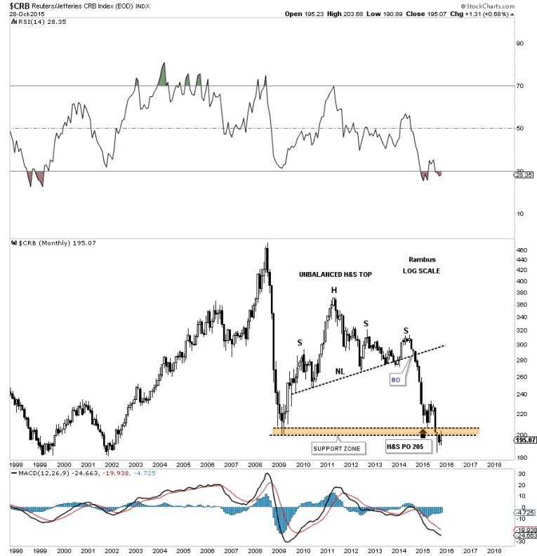 The further we go out in time the more interesting the price action looks. Below is a monthly chart for the CRB index which shows it has reached its H&S price objective at 205. Keep in mind this is a minimum price objective. Note how the price action is trading below the brown shaded S&R zone. This can’t be good if the US dollar is getting ready to breakout to the upside.