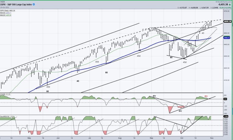 After a month-long correction -- its largest in about a year -- SPX rose to the all-time high of 4605 where it closed on Friday. The current short-term uptrend had an ideal projection to 4580-90, but after a 35-point re-accumulation pullback a renewal of buying lifted it to a new high. With the last short-term cycle making its low only a week ago, prices could still progress a little higher -- perhaps as high as 4620 before this cycle makes its high.