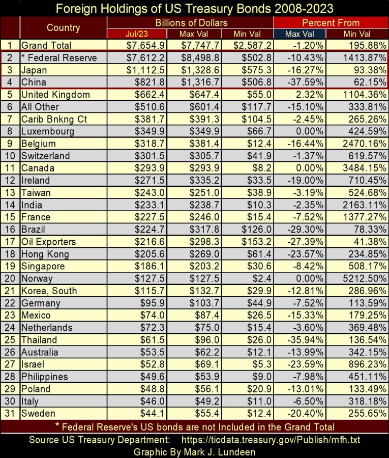 Looking at the table below Percent From / Max Val column (blue tab), the reduction of Treasury debt from peak holdings is given. In July 2023, only three countries’ holdings of Treasury debt saw new all-time highs (BEV Zeros / 0.00%);