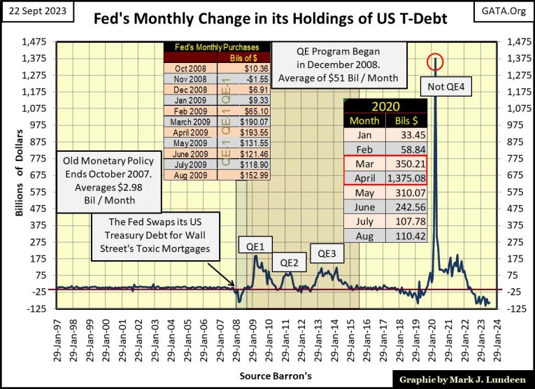 The last quote by Luo Ping was the Chinese reaction to Doctor Bernanke’s QE#1. In the chart below there is a table listing Doctor Bernanke’s monthly “injections of liquidity” into the financial system that got Director-General Luo’s attention. But when it came to devising “monetary policy,” Doctor Bernanke was a mere piker when comparted to FOMC Idiot-Primate Powell, and his Not QE#4.