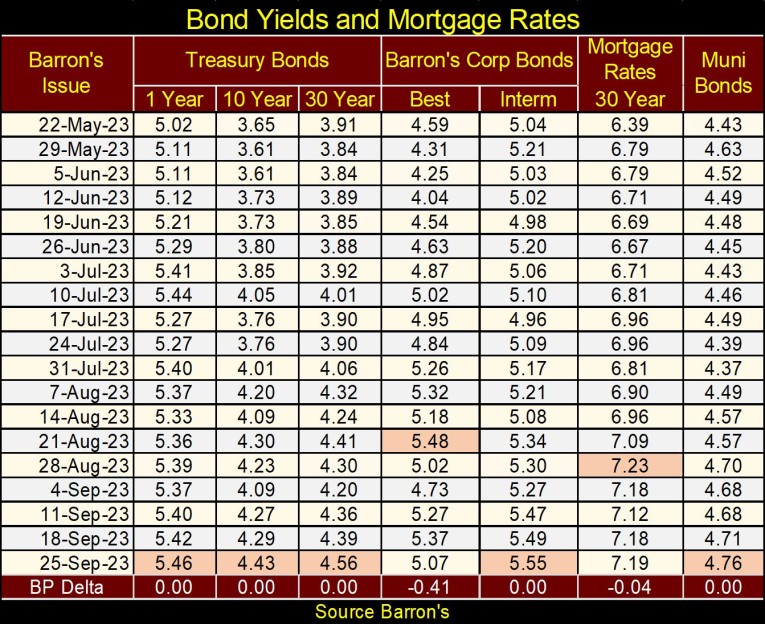 Next is the chart for a 30yr T-bond, issued in February 2020. This week, it closed with its all-time high yield of 4.61%. Multiples of its 1.19% yield seen in Barron’s 03 August 2020 issue.