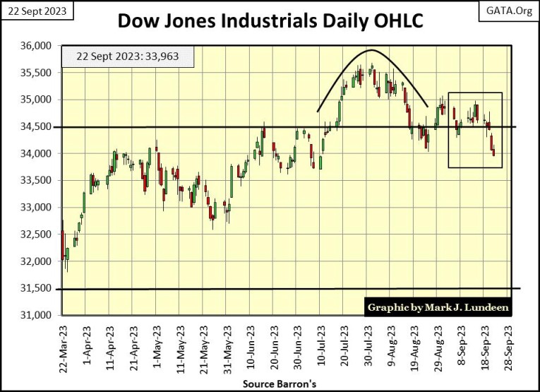 Next is the Dow Jones in daily bars. In late July and early August, the Dow Jones attempted to break above 36,000, but the weary-old bulls wandering aimlessly around Wall Street, couldn’t make that happen. Now at this week’s close, the Dow Jones closed below 34,000 for the first time since early July.