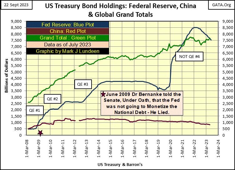 Okay, the FOMC isn’t buying China’s and Japan’s Treasury debt in the debt market. We’re told they too are net sellers in the Treasury market. Looking at the Grand Total holding, published by the Treasury Department in the chart below, it too is down by 1.20% from its peak holding.