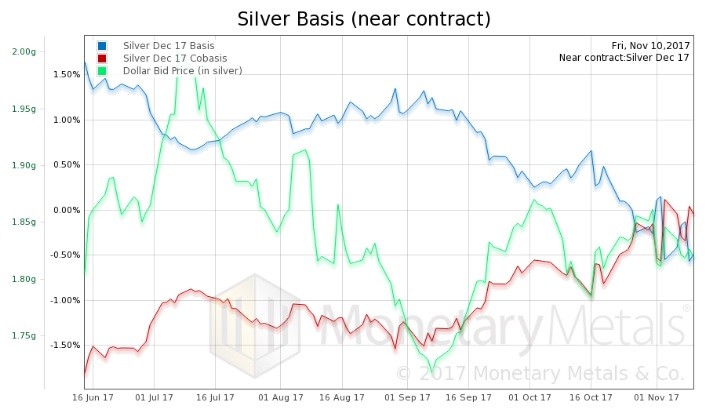 We also see the cobasis tracking the price of the dollar, keeping in mind that contract roll distortions are larger in silver than in gold owing to its lesser liquidity.