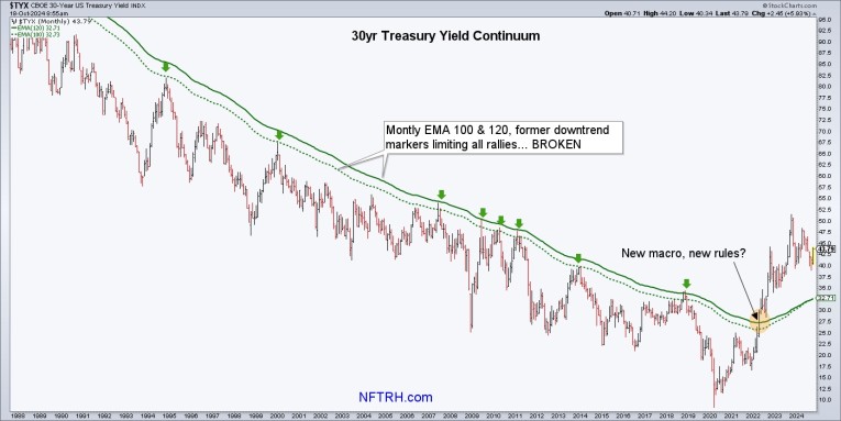 While stocks are finishing up the epic upside (all year our target has been “to or through the election” and at an extreme, into H1, 2025) instigated not only since 2020 under Trump and intensified under Biden since, but instigated in one form or another most intensely since 2001 as Alan the Maestro Greenspan kicked off the Age of Inflation onDemand and his offspring have concocted ever more ingenious variations of it right up until the bond market rebellion of 2022.