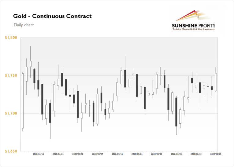 The gold futures contract gained 1.27% on Friday, as it broke slightly above the price level of $1,750. Last week’s Powell’s testimonies on Wednesday, Thursday and his Friday’s speech didn’t bring any new surprises for the financial markets. But gold got closer to its medium-term highs. However, it continues to trade within a consolidation, as we can see on the daily chart: