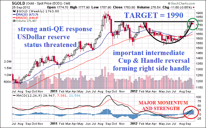 The response in the Gold price has smelled a QE3 in bond monetization since the summer months. The difference is that this time, unlike the deceptive Operation Twist, the bond purchases will be unsterilized with new money injected into the system. That is a Golden supercharge to recognizable inflation. A major intermediate reversal is underway, with a 1570 base, a 1780 top, which indicates a 1990 Gold price target. The kicker in the market is the broad mining industry strike, which extends from South Africa to South America. Gold supply will be inhibited. Expect some regrouping with a pause at the 1720-1770 area, as a critical consolidation takes place before a breakout that captures the world's attention. The right side handle is being formed, carved out. During this time, the doubters are tossed off the train. The new believers join. A recycle process is underway, as the monetary dumb are unloaded and new intelligent soldiers join the ranks. The renewal will permit a run over $2000. Once over 1800 price level, the 1900 resistance will be overrun like a paper fortress by angry mobs bearing torches and sticks. But in the meantime, a big battle is being waged at the right side handle, a consolidation before breakout.