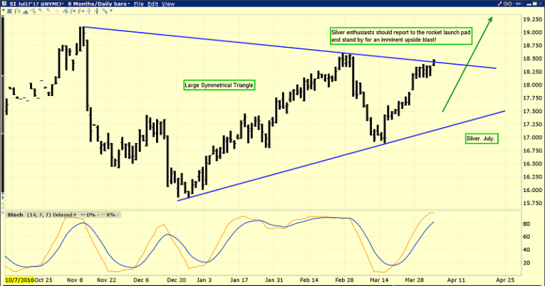 I think the caption on that chart says all that any silver investor needs to know right now. There’s a beautiful symmetrical triangle pattern in play. While the bears are probably sleeping this morning, silver is attempting an upside breakout!