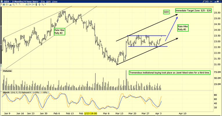 In early morning trading, GDX has raced to the upper part of a rectangle. It seems poised for an imminent breakout and rally to my $26 target. I’m a relentless buyer of GDX on every $1 decline. Here’s why: Inflation is set to break out to the upside. Indian demand is empowered by the now-mighty rupee and the world’s greatest gold investor demographics. A looming US government debt crisis endgame lurks horrifically in the shadows. The bottom line: A rally to $26 for GDX will not mark the end of the gold stocks price action on the upside. It’s only the beginning of what I have suggested is not just a bull market, but a real bull era!