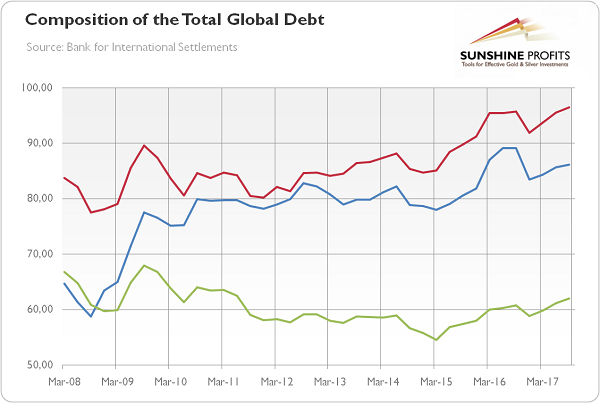 Indeed, the elephant is doing well. It is well-nourished and constantly growing. As the chart below shows, total non-financial debt has risen from 191 percent of global GDP at the end of 2001 to 210 percent before the financial crisis and to 245 percent today (the most recent data are for the end of September 2017).