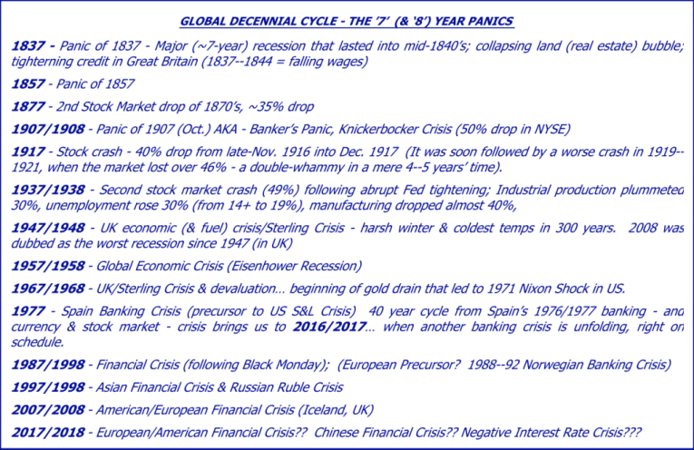 In many cases, the ‘7’ year also experienced serious ’panics’ of some sort… a reaction to the events that had preceded it (see Global Decennial Cycle table, first published in Dec. 2016 INSIIDE Track, which includes corresponding events in Europe).