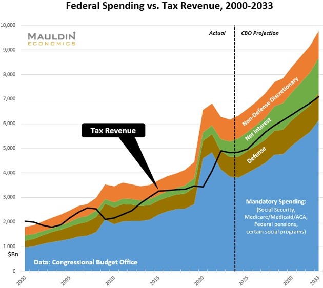 “Deficits will double from $1.4 trillion today to almost $2.9 trillion by 2033. Deficits will total 6.1 percent of GDP ($20.3 trillion) over a decade and reach 7.3 percent of GDP by 2033—the highest ever outside of a national emergency.”