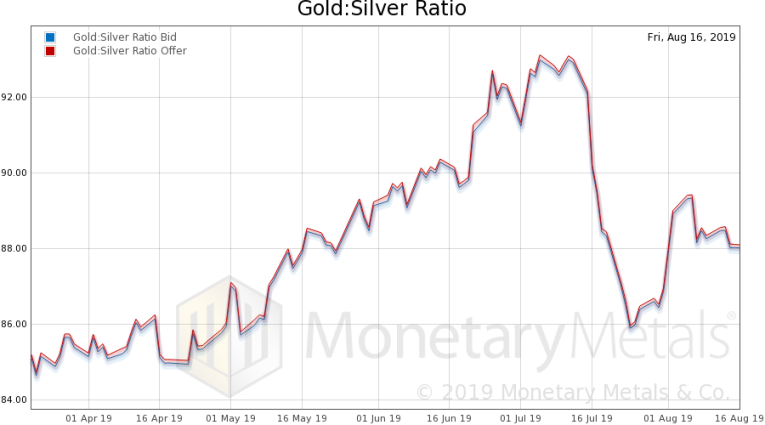 Next, this is a graph of the gold price measured in silver, otherwise known as the gold to silver ratio (see here for an explanation of bid and offer prices for the ratio). The ratio inched up this week.