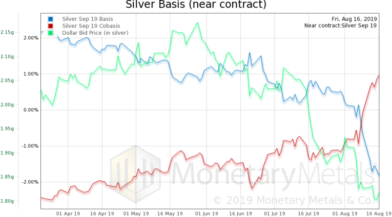 The scarcity of silver appears to be up. But keep in mind that the September silver contract is nearing expiry. And it is subject to temporary backwardation, due to selling pressure from all the naked longs who must roll their positions. There is a (smaller) rise in the silver basis continuous too.