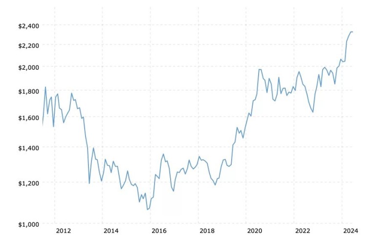 After allowing for the effects of inflation, an ounce of gold at $2400 today is no more valuable than it was at $2000 in 2020, or $1825 in 2011, or $677 in 1980. For that matter, the purchasing power of one ounce of gold is the about the same today as it was a century ago when it was priced at $20.67. In other words, if you bought gold at any of those prices and held it until now, you do not have real profits. The higher gold price is not a profit. It represents the dollar's loss of purchasing power. (There are possible short-term trading opportunities for traders. See Understanding Profit Potential In Gold)
