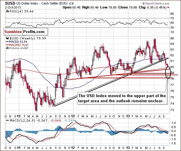 Taking the above into account, investors are focusing now on the U.S. government shutdown and its impact on the dollar, and probably wondering where the final bottom of the current corrective move will form. When we take a look at the chart, we see that the dollar dropped to its new eight-month low in the previous week. What’s interesting, at the same time we didn’t notice a sharp increase in gold. This relationship between the U.S. dollar and gold has encouraged us to examine the US Dollar Index once again (from many perspectives) and the medium-term gold chart to see if there’s anything on the horizon that could drive gold prices higher or lower shortly. We’ll start with the USD Index very long-term chart (charts courtesy by http://stockcharts.com).