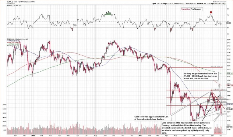 The recent week was tough for the U.S. currency. Investors avoided the dollar as uncertainty over the U.S. government shutdown and the upcoming debate on the debt ceiling weighed on sentiment. The shutdown, with its suspension of funding for government workers and some programs, could hamper U.S. growth and delay tapering. Therefore, some investors buy gold as a safe haven or alternative to the U.S. dollar on the view that it will outperform other assets during political or economic turmoil. However, looking at chart of gold, it seems that these circumstances have had a limited effect on the gold market.