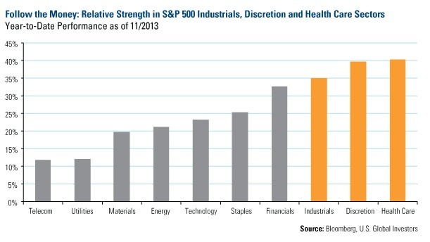 All opinions expressed and data provided are subject to change without notice. Some of these opinions may not be appropriate to every investor. The S&P 500 Index is a widely recognized capitalization-weighted index of 500 common stock prices in U.S. companies. The Purchasing Manager’s Index is an indicator of the economic health of the manufacturing sector. The PMI index is based on five major indicators: new orders, inventory levels, production, supplier deliveries and the employment environment. Standard deviation is a measure of the dispersion of a set of data from its mean. The more spread apart the data, the higher the deviation. Standard deviation is also known as historical volatility. The following securities mentioned were held by one or more of U.S. Global Investors Funds as of 9/30/13: General Electric, Amazon.com, Celgene.
