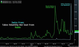 - On January 15, 2015 the Swiss National Bank (SNB) suspended its 3-year old commitment to the Swiss franc-Euro peg, sending the Swiss franc’s volatility above the Ruble’s! Here is what happened to investors in the formerly “solid” Swiss markets: