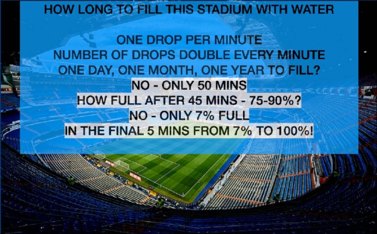 We will see a very similar exponential pattern with the coming debt explosion. If we assume that the final 5 minutes of the exponential phase started in September 2019, the stadium was then only 7% full and will in the next few years grow from 7% to 100% full or 14X from here.
